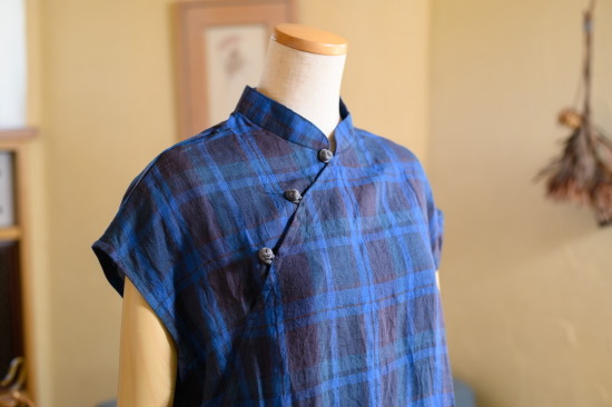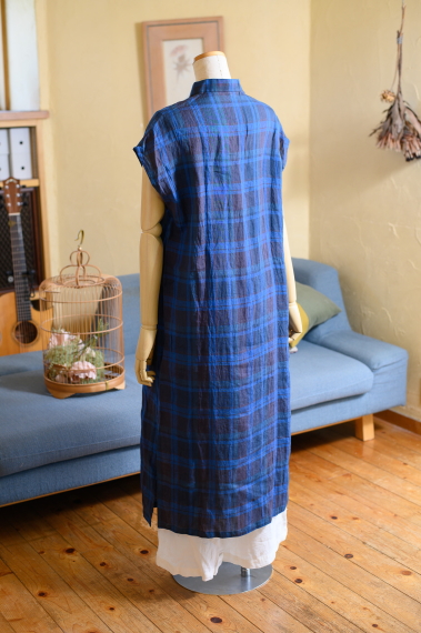 麻素材チャイナワンピース 藍紺格子