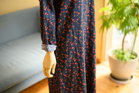 厚地のネイビー素材に、品のいいオレンジの花柄がとてもステイなワンピースです。