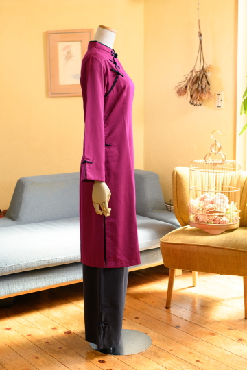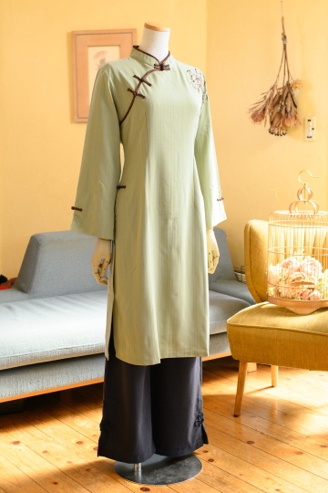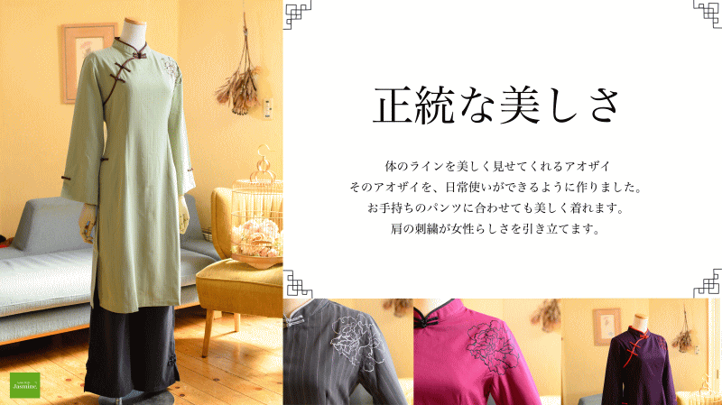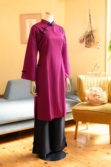 ![]() ハンサムレディアオザイ(パンツは付属なし) 12000+TAX(13200) ![]() 以前、Jasmine.で大人気だったハンサムなアオザイ。 その時の生地があまりに素敵だったので、残りを大事に保管しておりました。 「あのアオザイの色違いが欲しい」などいろいろご意見を頂戴しまして このたび、同じデザインで仕立てました! アオザイとしてはあまりない生地感でかっこいいです。 華やかさもありますが、生地がコットンベースのため お手持ちのデニムやパンツととても簡単になじみます。 ロングスカートをあわせるのも手ですよ。 通常アオザイはサイドはわき腹が少しのぞくようなデザインですが スリットをやや下げてカジュアル感をUPさせました。 ![]() 裾を短く補正すればもっとカジュアルな印象にもなります。 着ていて飽きたら、カットするというのもお勧めです。 *素材* コットン・ポリエステル ハリのあるやや厚地の素材です *サイズ* Mサイズ バスト93cm 袖丈52cm 着丈99cm 肩幅38.5cm Lサイズ バスト97cm 袖丈53cm 着丈100cm 肩幅39cm *お手入れ* 手洗い(おしゃれ着用洗剤にて) ランドリーネット使用 オシャレ着用洗剤使用 アイロン高温 *色移り注意のため最初の3~4回は1枚でお洗濯ください。 プラムレッド ![]() こっくりとした葡萄色にビビッドな赤のサテンのパイピングデザイン ![]() ![]() 体の線を拾いすぎないのでとても着やすいです。 でもシルエットはとてもきれいですよ ![]() ![]() 刺繍はこんなかんじ。背面にも刺繍があります。 |