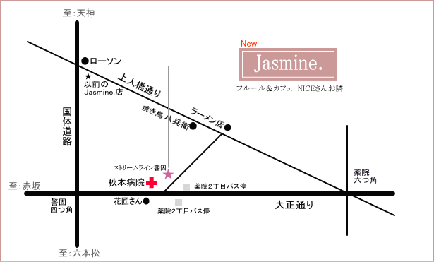 *西鉄福岡駅から徒歩で15分・薬院駅から徒歩10分 *西鉄バス「薬院2丁目」から徒歩1分 福岡市中央区警固1−3−3 ストリームライン警固1F 092−732−9700 お解りでない方は、お電話くださいませ。 (接客などにより、おとりできない場合がございます。ご了承ください) お隣は、花屋のNICEさん。 カフェも併設しているお花やさんです。 |