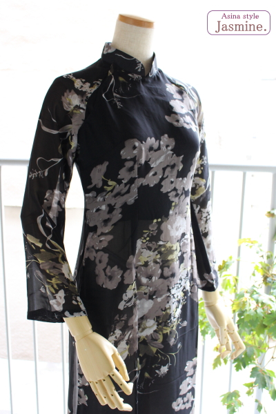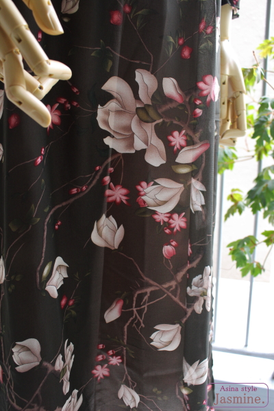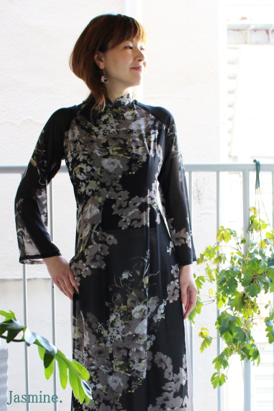| フラワーシフォンシルエット 黒地にグレーの花嵐のような模様が入っています。 うっすらところどころに入るグリーンが優しいニュアンスを添えています。 ![]() モデルは身長168cm B87cm ウエスト66cm ヒップ93cmでMサイズ着用 ![]() ![]() ![]()
